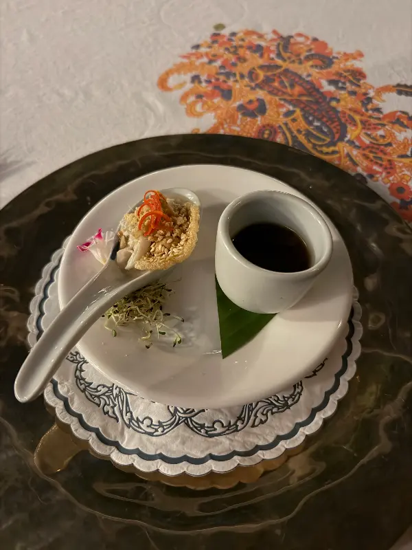 코스 요리 중간중간에 제공되는 음료와 곁들임 음식들도 훌륭했습니다. 특히, 신선한 과일 주스는 입안을 상쾌하게 해 주었고, 태국 전통 방식으로 만든 디저트는 달콤한 마무리를 선사했습니다.