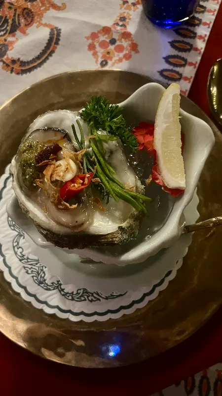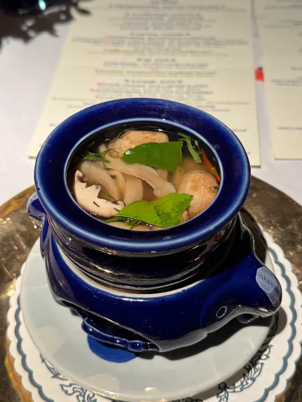 레스토랑에 들어서는 순간, 마치 다른 세계에 온 듯한 착각에 빠졌습니다. 앤티크 가구와 은은한 조명, 그리고 섬세한 장식들이 어우러져 고풍스러우면서도 아늑한 분위기를 자아냅니다. 마치 태국 왕실의 만찬에 초대받은 듯한 기분이었습니다. 푸르른 정원이 내다보이는 창가 자리에 앉아, 메뉴를 펼쳐 들었습니다. 저는 블루 엘리펀트의 명성을 제대로 경험하기 위해 헤리티지 테이스팅 메뉴를 선택했습니다.