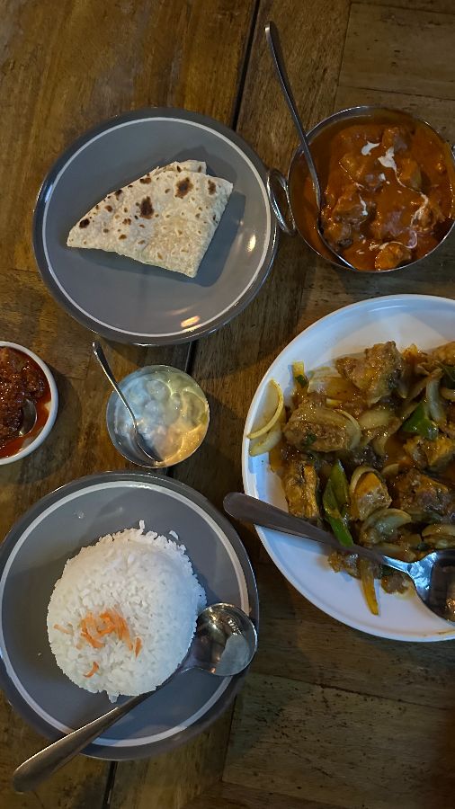 SAFFRON의 진정한 매력은 다채롭고 풍미 가득한 음식에 있습니다. 인도 밖에서 9년 동안 살았다는 한 리뷰어는 이곳 음식을 “인도 밖에서 먹어본 최고의 인도 음식”이라고 극찬하며, 일반적인 인도 식당과는 차원이 다른 동부 인도 특유의 풍미를 느낄 수 있다고 강조했습니다. 이 사진은 SAFFRON의 식탁에서 흔히 볼 수 있는 풍성한 음식들을 보여주는데, 버터 치킨의 진한 주황빛과 갓 지은 밥의 새하얀 빛깔이 시각적으로도 즐거움을 선사합니다.
