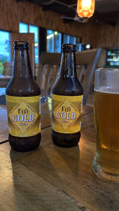 따뜻한 조명 아래, 시원한 ‘Fiji Gold’ 맥주 두 병과 유리잔에 담긴 맥주가 테이블 위에 놓여 있습니다. 나무로 된 실내 인테리어와 어우러져 편안하고 아늑한 분위기를 연출합니다.