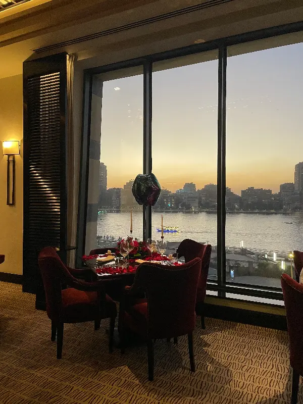 레스토랑에 들어서자마자 눈 앞에 펼쳐지는 나일강의 야경은 탄성을 자아내게 합니다. 은은하게 빛나는 조명 아래, 테이블에는 기대감이 가득한 표정의 사람들이 앉아 있습니다. 창밖으로는 카이로 시내의 불빛들이 반짝이며 낭만적인 분위기를 더합니다. 마치 영화 속 한 장면처럼 아름다운 풍경입니다. 최고의 경치를 감상하려면 흡연석을 요청하라는 팁은, 이곳이 단순한 식당이 아닌 특별한 ‘경험’을 선사하는 공간임을 암시합니다.