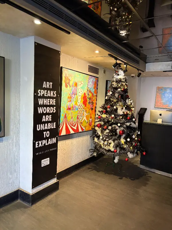 레스토랑으로 향하는 엘리베이터에서 내리자마자, 붉은색(Crimson)을 테마로 한 세련된 인테리어가 눈에 들어옵니다. 은은한 조명 아래 놓인 예술 작품들과 모던한 가구들은 고급스러움을 더하며, 특별한 시간을 예감하게 합니다. “ART SPEAKS WHERE WORDS ARE UNABLE TO EXPLAIN”이라는 문구가 적힌 검은색 배너와 크리스마스 트리 장식이 놓여져 있는 모습은, 레스토랑의 분위기를 더욱 풍성하게 만들어줍니다. 마치 미술관에 온 듯한 감각적인 공간은, 식사 전부터 기분 좋은 설렘을 안겨줍니다.