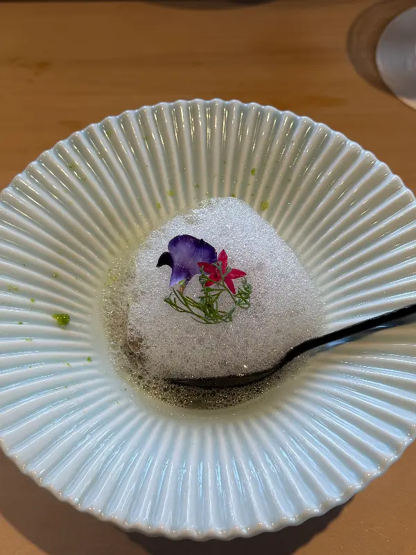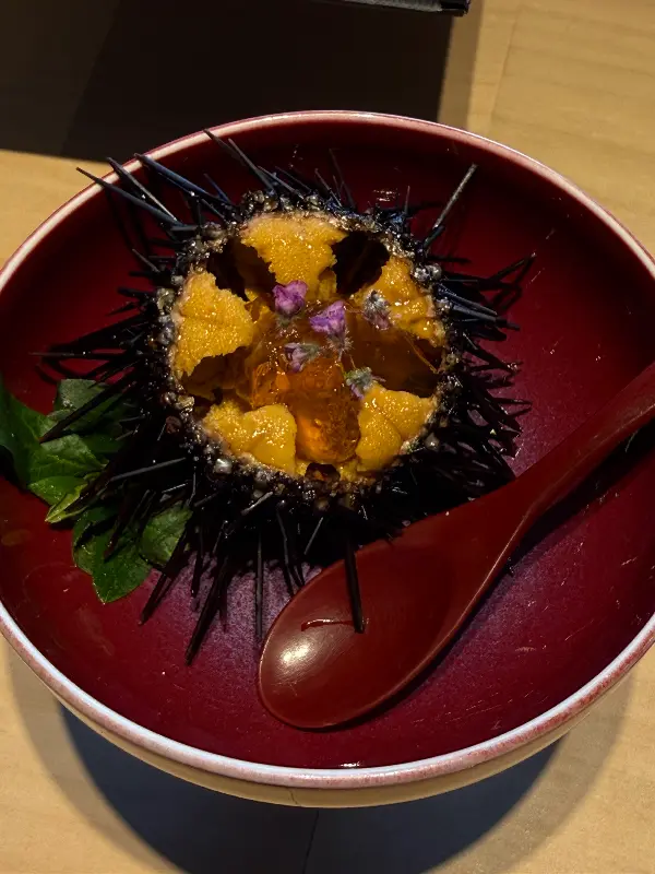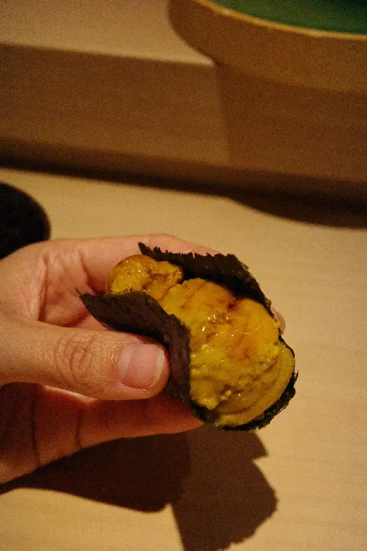 코스 요리의 시작은 신선한 해산물로 만든 샐러드였습니다. 톡톡 터지는 날치알과 아삭한 채소, 그리고 새콤달콤한 드레싱이 입맛을 돋우었습니다. 다음으로 등장한 것은 기대하고 고대했던 우니였습니다. 마치 보석처럼 빛나는 우니는 김에 감싸져 나왔는데, 입에 넣는 순간 바다의 향이 입안 가득 퍼져 나갔습니다. 신선하고 녹진한 우니의 풍미는 정말 잊을 수 없는 맛이었습니다.