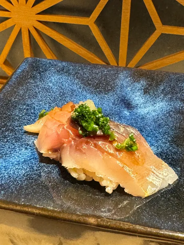 스시 코스가 시작되면서 다양한 종류의 스시들이 차례대로 나왔습니다. 도미, 참치 뱃살, 옥돔 등 신선한 네타(스시 위에 올려지는 재료)는 숙성 과정을 거쳐 더욱 깊은 풍미를 자랑했습니다. 특히 인상적이었던 것은 숙성된 도미와 참치 뱃살 타다끼 초밥이었습니다. 은은하게 감도는 불향과 부드러운 식감은 입안에서 황홀한 조화를 이루었습니다.