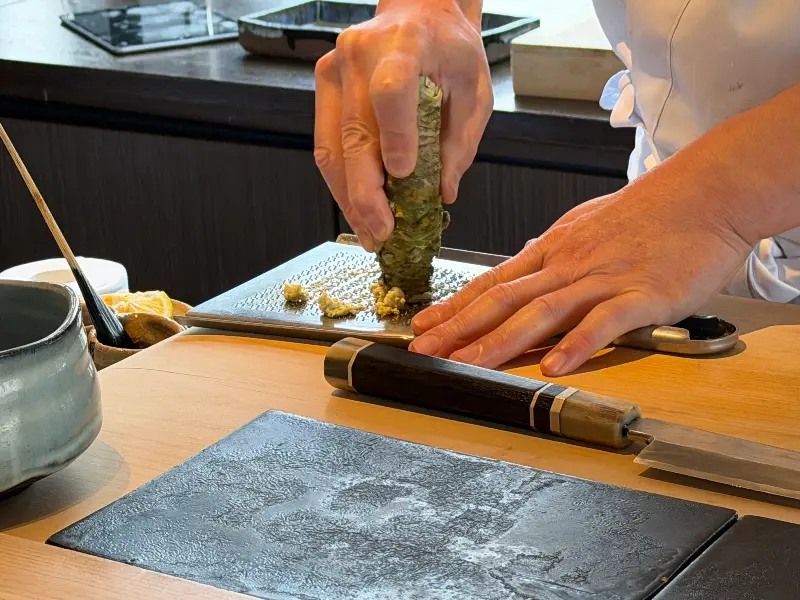 자리에 앉자 따뜻한 물수건과 함께 정갈한 세팅이 눈에 들어왔습니다. 테이블 위에는 젓가락 받침과 간장 종지, 그리고 작은 꽃 한 송이가 놓여 있었는데, 세심한 배려가 느껴져 기분이 좋아졌습니다. 곧이어 한국인 직원분이 친절하게 메뉴를 설명해 주셨습니다. 메뉴는 코스 요리로 구성되어 있었고, 제철 식재료를 사용한 다양한 스시와 요리들을 맛볼 수 있다고 했습니다.