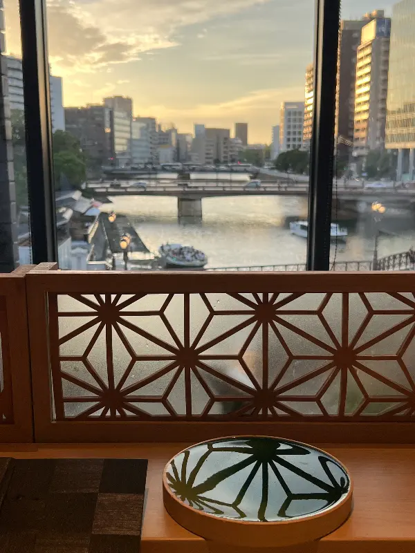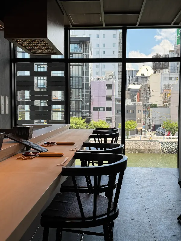 두근거리는 마음을 안고 예약 시간에 맞춰 스시야에 도착했습니다. 은은한 조명이 따뜻하게 감싸는 공간은 아늑하면서도 고급스러운 분위기를 자아냈습니다. 창밖으로는 잔잔하게 흐르는 나카스 강이 한눈에 들어왔습니다. 저녁 시간대에 방문하면 더욱 낭만적인 풍경을 감상할 수 있을 것 같았습니다.