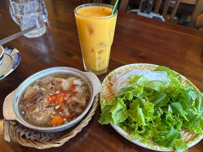 다음으로 맛본 것은 베트남 대표 음식 중 하나인 분짜였다. 신선한 채소와 쌀국수, 그리고 숯불 향이 은은하게 느껴지는 돼지고기를 새콤달콤한 느억맘 소스에 적셔 먹는 맛은 그야말로 일품이었다. 채소의 아삭함과 쌀국수의 쫄깃함, 돼지고기의 풍미가 어우러져 입안 가득 행복을 선사했다. 특히 느억맘 소스의 새콤달콤함은 입맛을 돋우는 데 제격이었다.