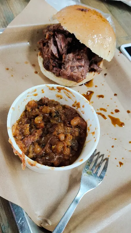 드디어 자리가 마련되고, 안내해 주시는 분의 추천을 받아 메뉴를 주문했다. 브레이즈드 비프 브리스킷 버거와 백립을 선택했다. 잠시 후, 기다리고 기다리던 음식이 나왔다. 버거는 빵 사이에 촉촉한 브리스킷이 가득했고, 백립은 윤기가 흐르는 모습이 먹음직스러웠다. 쟁반 위에 놓인 버거 옆에는 사이드로 보이는 작은 그릇에 담긴 콘 샐러드가 함께 놓여 있었다.