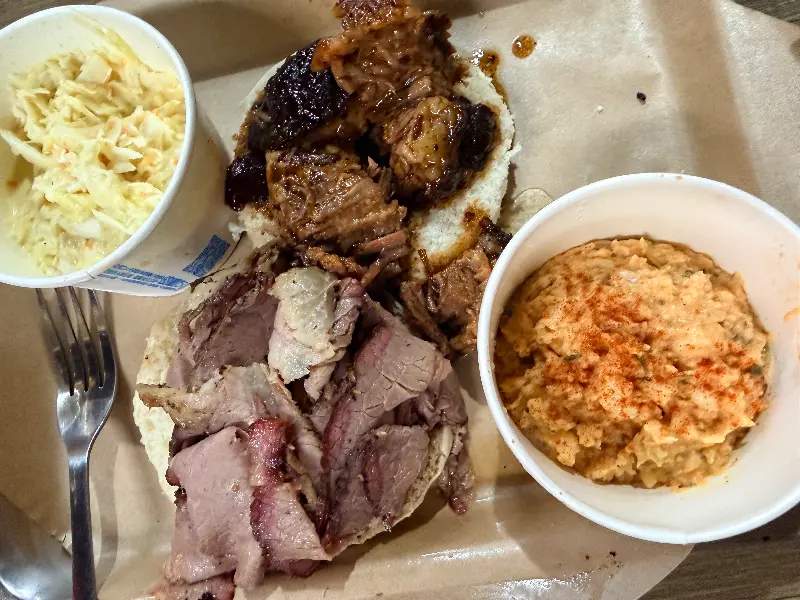 촉촉한 브리스킷과 풀드포크, 그리고 톡 쏘는 코울슬로의 조화.