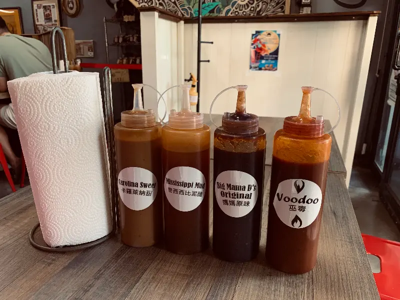 다양한 바베큐 소스가 준비되어 있어 취향에 맞게 즐길 수 있다.