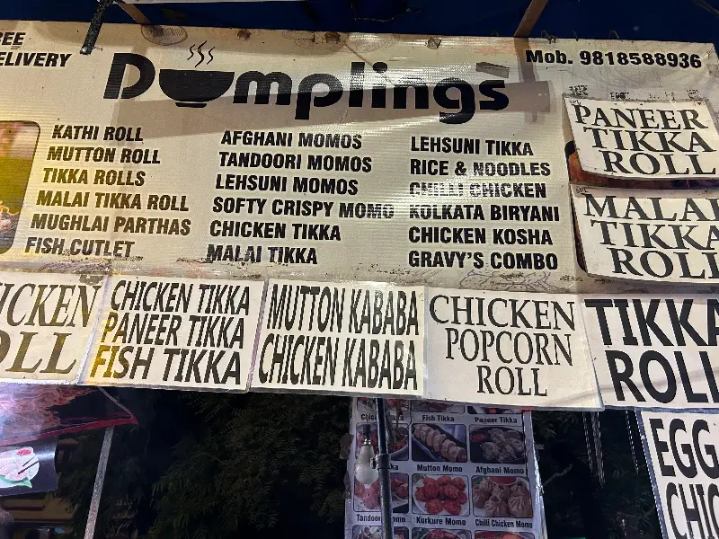 특히 눈에 띄는 것은 메뉴를 가득 채운 다양한 종류의 롤입니다. “치즈 머튼 롤”, “칠리 머튼 롤”, “머튼 시크 롤” 등 이름만 들어도 군침이 도는 메뉴들이 즐비합니다. “스페셜 피쉬 카티 롤”은 Dumplings만의 특별함을 담은 메뉴로, 신선한 생선과 매콤한 소스의 조화가 일품입니다.