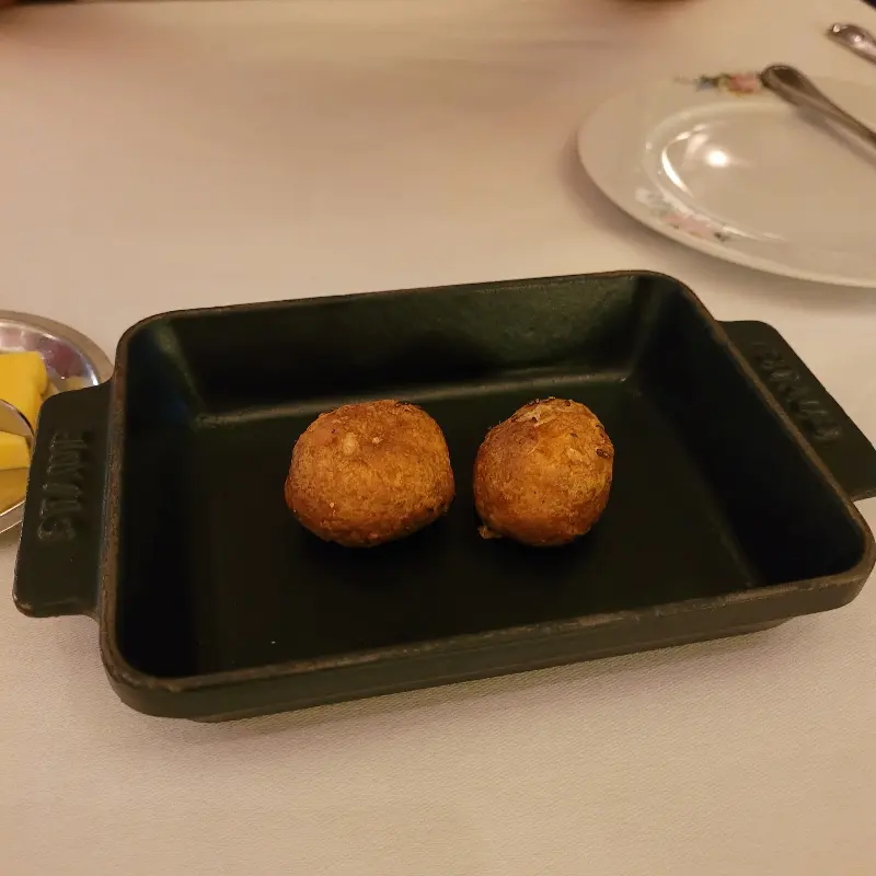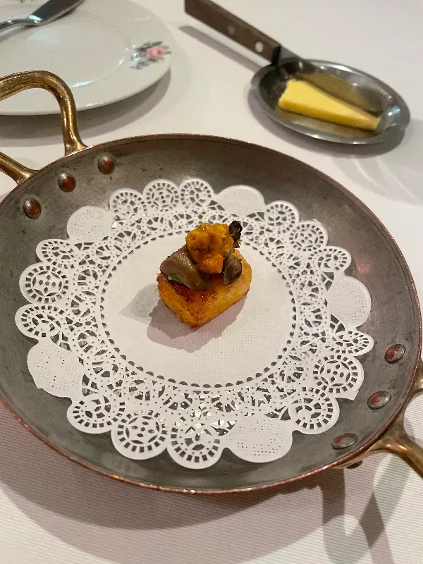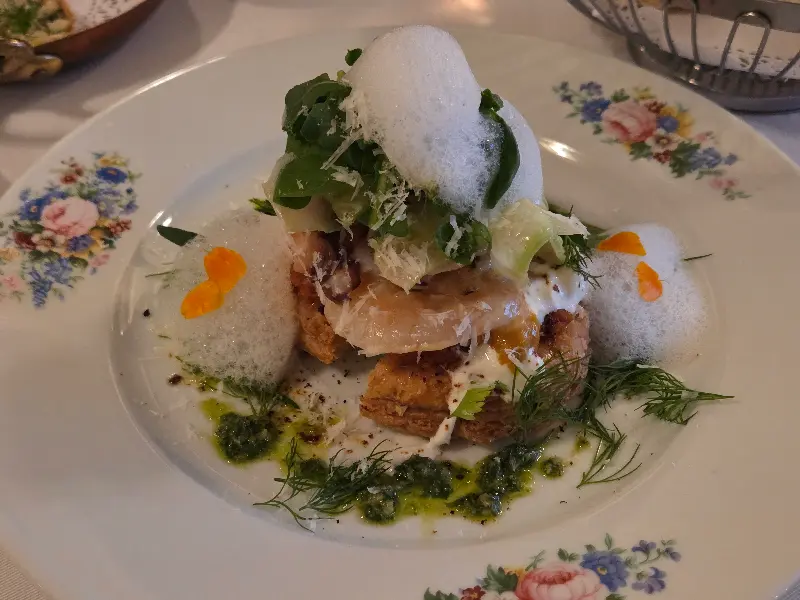 가장 먼저 식전 빵과 함께 작은 타르타르 요리가 나왔습니다. 바삭하게 구워진 빵과 부드러운 타르타르의 조화는 입맛을 돋우기에 충분했습니다. 이어서 차가운 전채 요리가 나왔는데, 신선한 야채의 절임에 새콤한 맛이 더해져 입안을 상쾌하게 만들어주었습니다.