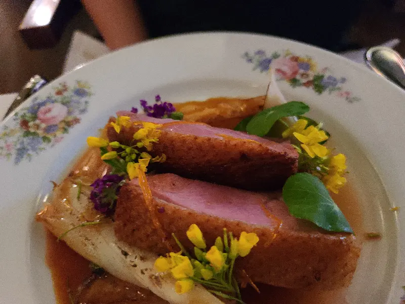 메인 요리로는 드라이에이징 오리가슴살을 선택했습니다. 겉은 바삭하고 속은 촉촉한 오리가슴살은 입안에서 살살 녹았습니다. 특히, 드라이에이징 과정을 거쳐 더욱 깊어진 풍미는 잊을 수 없는 맛이었습니다. 곁들여 나온 소스와 가니쉬와의 조화도 훌륭했습니다.