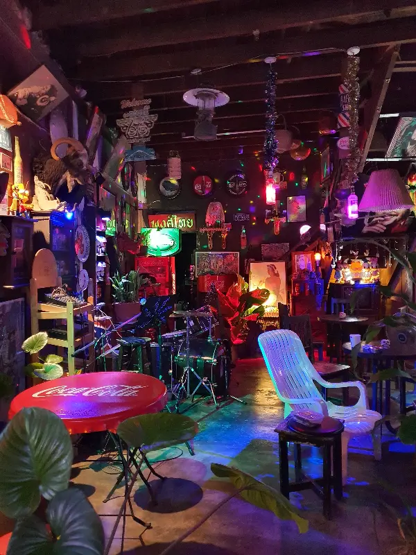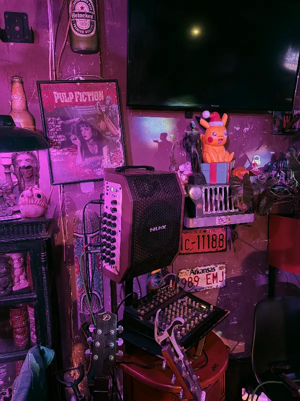 사진 속 벽면에는 영화 “펄프 픽션” 포스터와 다양한 피규어들이 장식되어 있습니다. 이러한 소품들은 KULOY의 개성을 더욱 돋보이게 하며, 음악과 함께 KULOY만의 독특한 분위기를 만들어냅니다.