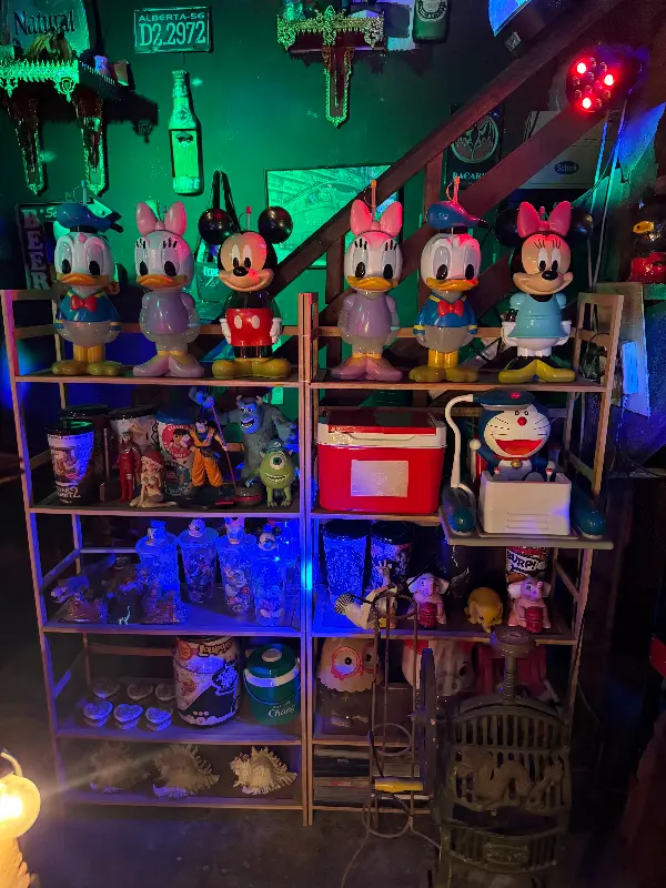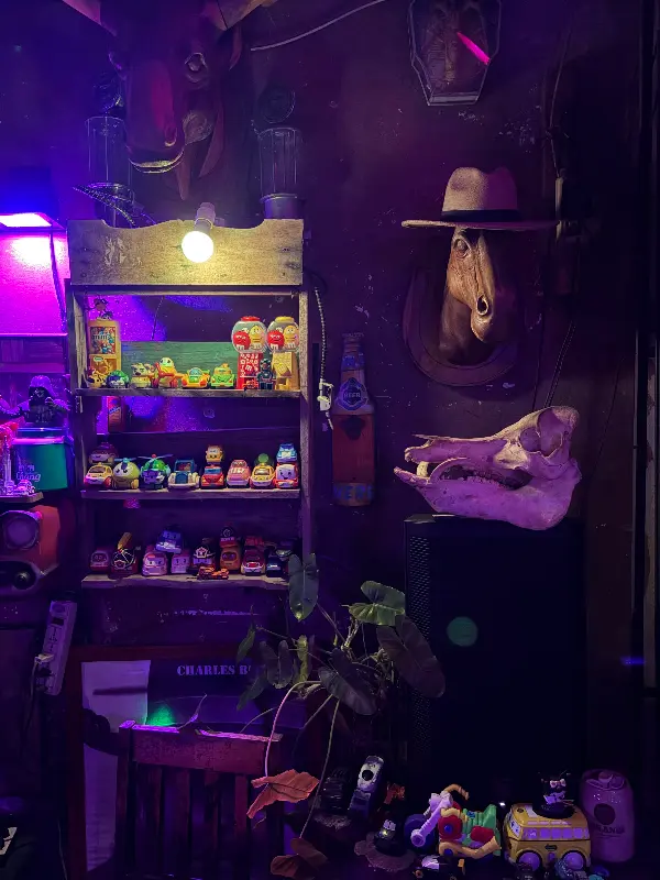 보라색 조명 아래 전시된 장식품들은 KULOY의 몽환적인 분위기를 더욱 강조합니다. 낡은 나무 선반 위에 놓인 작은 장난감들과 빈티지 소품들은 마치 시간 여행을 떠나온 듯한 느낌을 선사합니다.