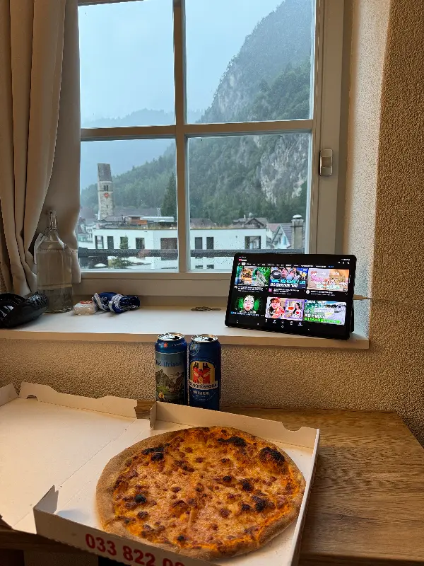 창밖으로 보이는 인터라켄의 풍경을 감상하며 즐기는 피자 한 조각은 잊지 못할 추억이 된다. 창밖에는 고풍스러운 건물과 스위스의 푸르른 자연이 펼쳐진다.