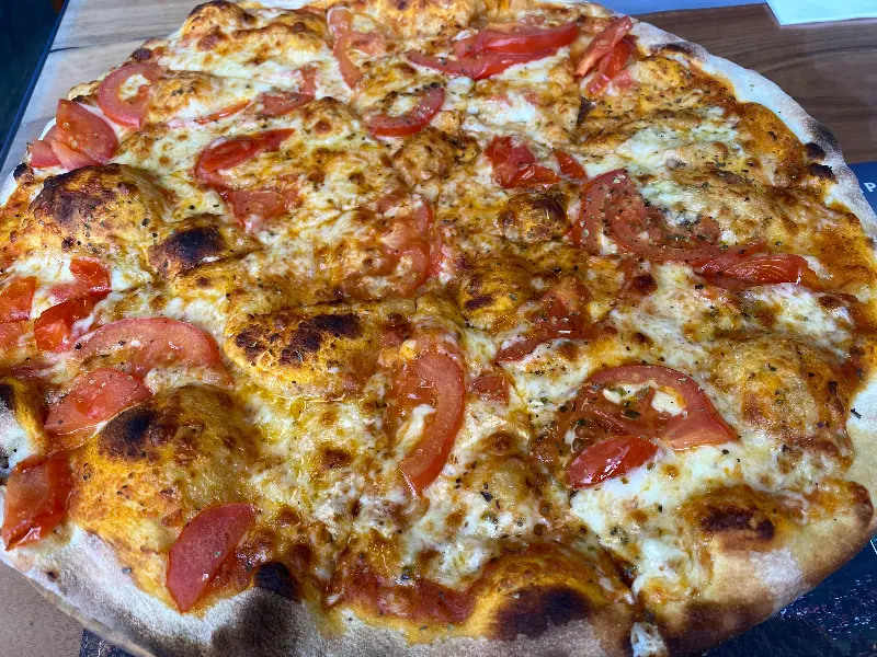 토마토 슬라이스가 듬뿍 올라간 피자는 신선한 맛을 자랑한다.