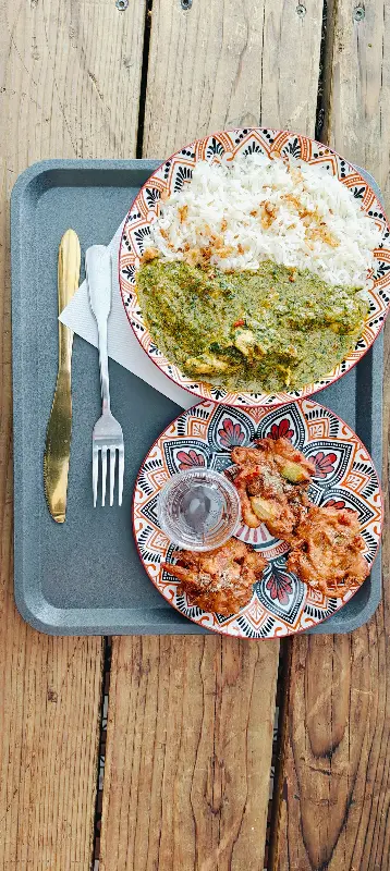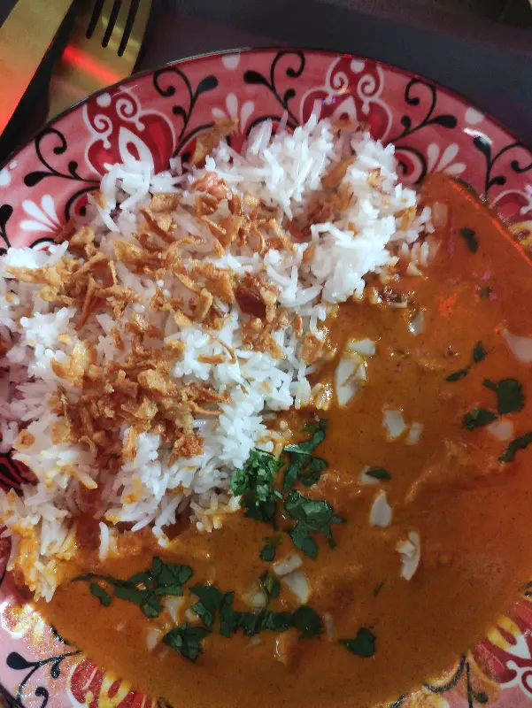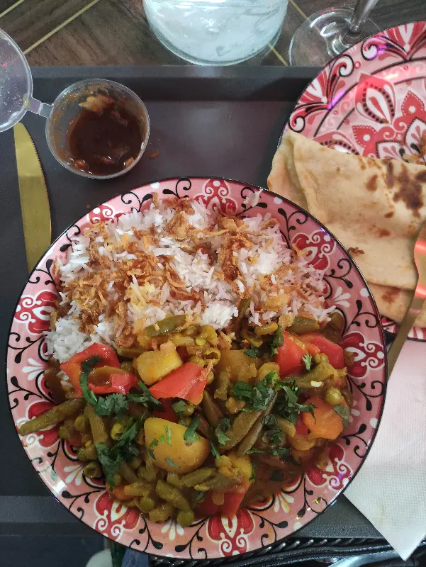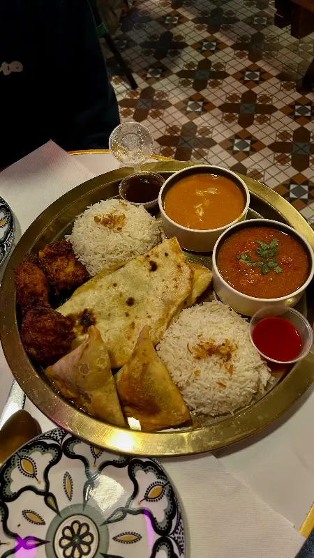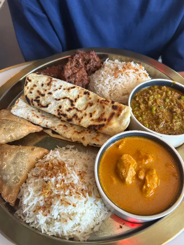 드디어 기다리고 기다리던 탈리가 나왔다. 접시에는 다양한 종류의 커리, 밥, 난, 사모사 등이 보기 좋게 담겨 있었다. 가장 먼저 눈에 띈 것은 윤기가 흐르는 버터 치킨이었다. 닭고기 한 점을 입에 넣으니, 부드러운 식감과 함께 풍부한 풍미가 입안 가득 퍼졌다. 소스는 크리미하면서도 약간의 단맛이 느껴졌는데, 닭고기와 완벽하게 어우러졌다.