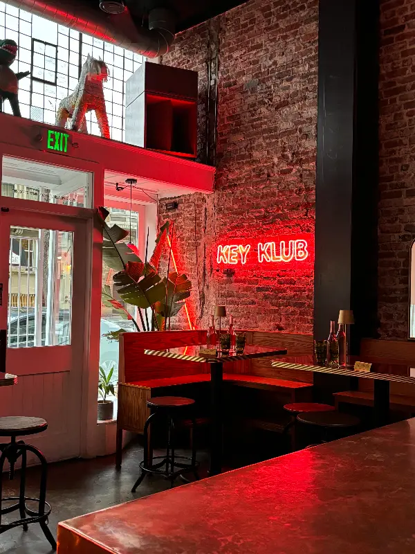 Key Klub은 단순한 바(Bar)를 넘어, 샌프란시스코의 젊음과 활기를 느낄 수 있는 문화 공간과 같습니다. 노출된 벽돌과 네온사인, 그리고 트렌디한 음악이 어우러져 독특한 분위기를 자아냅니다. 붉은 조명 아래 사람들은 각자의 방식으로 금요일 밤을 즐기고 있었습니다. 친구들과 함께 시끌벅적한 대화를 나누는 사람들, 음악에 맞춰 몸을 흔드는 사람들, 바텐더와 농담을 주고받는 사람들… 그 모든 모습이 Key Klub의 매력을 더합니다.