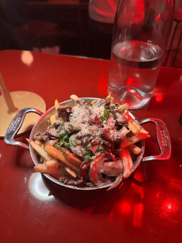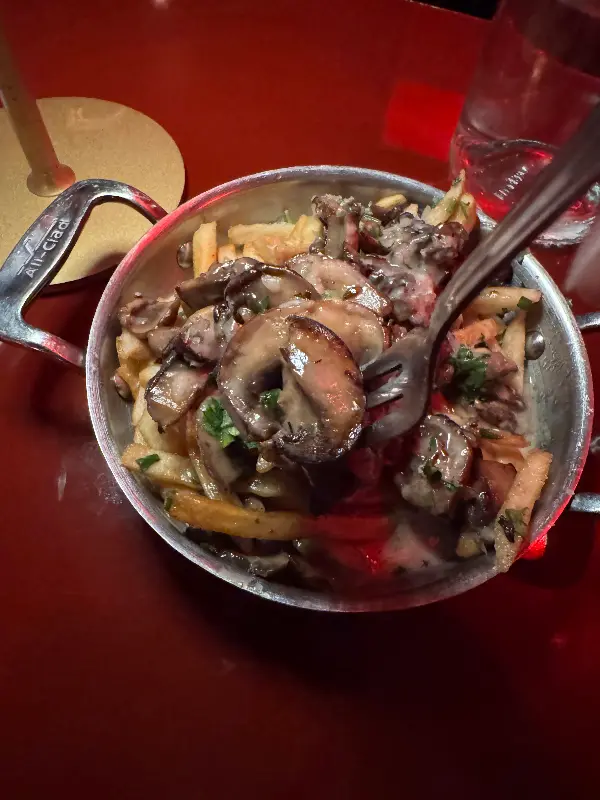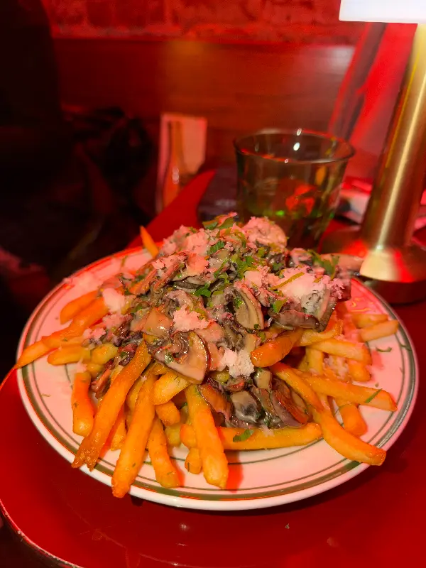 드디어 기다리던 버섯 푸틴이 나왔습니다. 따뜻한 감자튀김 위에 버섯과 치즈, 그리고 특제 소스가 듬뿍 올려져 있었습니다. 한 입 베어 무는 순간, 입안 가득 퍼지는 풍미에 감탄했습니다. 짭짤하면서도 고소한 맛, 그리고 부드러운 식감이 완벽하게 어우러졌습니다. 특히 버섯의 향이 정말 좋았는데, 신선한 재료를 사용했다는 것을 느낄 수 있었습니다.