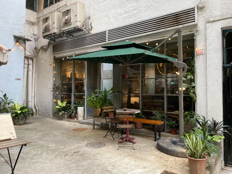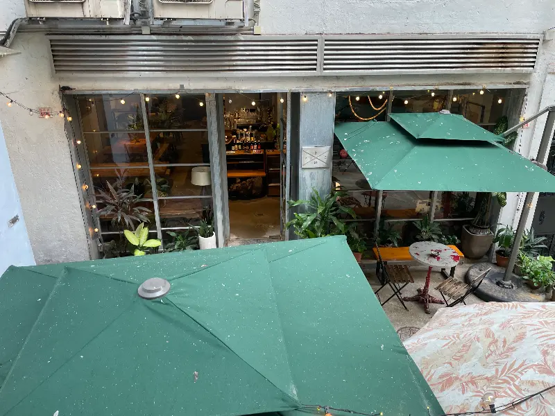 골목 어귀에 다다르자, 예상보다 훨씬 더 매력적인 공간이 눈 앞에 펼쳐졌다. 넓은 야외 테이블은 초록색 파라솔 아래 여유로운 분위기를 자아냈고, 은은한 조명이 켜진 실내는 따뜻하고 아늑한 느낌을 주었다. 나무 향이 은은하게 풍기는 실내 공간은 마치 비밀 아지트에 들어온 듯한 기분이었다. 첫인상부터 완벽했다.