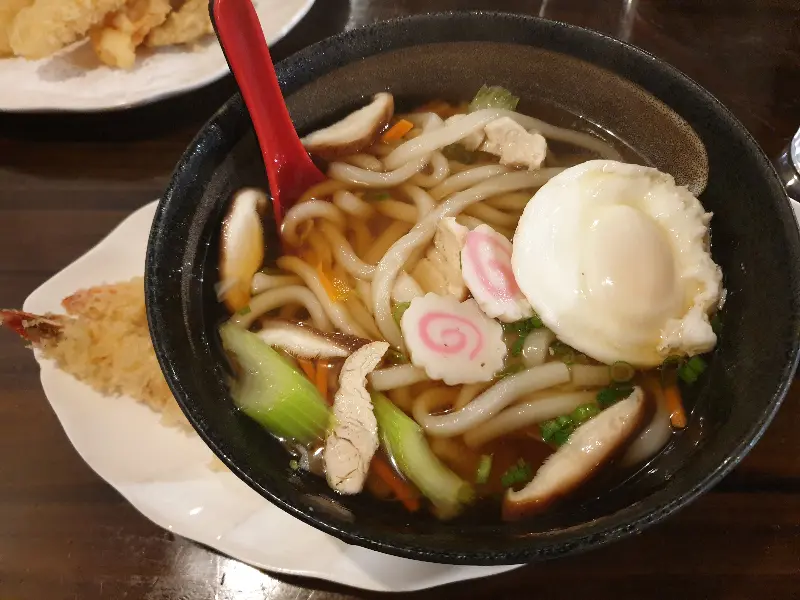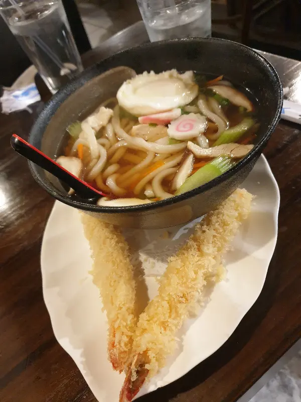 검붉은 옻칠이 된 듯한 그릇에 담겨 나온 우동은 시각적으로도 풍성함을 자랑했다. 뽀얀 우동 면 위로 반숙 계란, 핑크색 소용돌이 모양의 어묵, 닭고기, 버섯, 채소가 가지런히 놓여 있었다. 특히 눈길을 사로잡는 것은 큼지막한 새우튀김. 갓 튀겨져 노릇노릇한 자태를 뽐내는 새우튀김은 바삭한 소리를 내며 입 안에서 부서졌다. 촉촉한 새우 살과 고소한 튀김옷의 조화는 더할 나위 없이 훌륭했다.