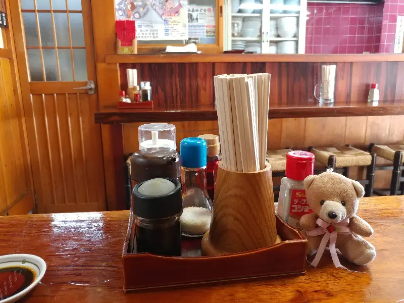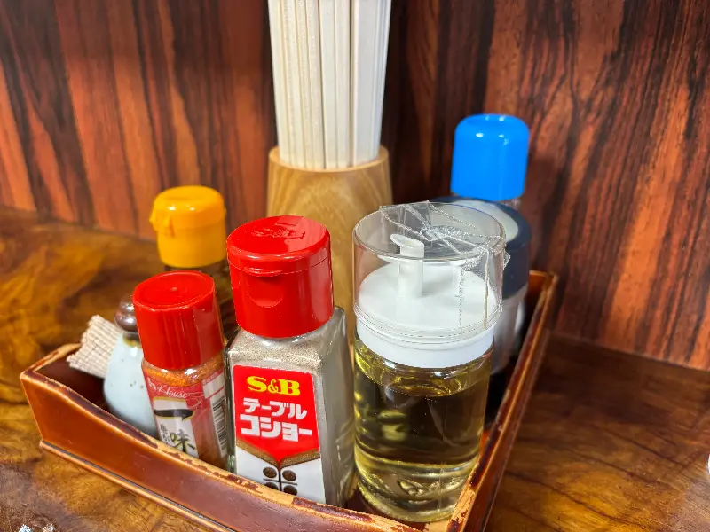 테이블 위에 가지런히 놓인 조미료 세트. 취향에 따라 라멘에 첨가하여 맛을 더할 수 있다.