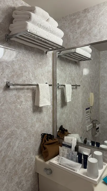 객실에는 다양한 편의시설이 갖춰져 있었습니다. 220V 콘센트가 있어 따로 어댑터를 준비하지 않아도 되었고, 모든 기종 충전이 가능한 젠더도 준비되어 있어 정말 편리했습니다. 욕실은 깨끗하고 넓었으며, 욕조도 깊고 넓어 반신욕을 즐기기에 좋았습니다.