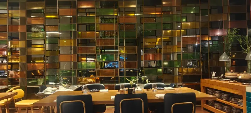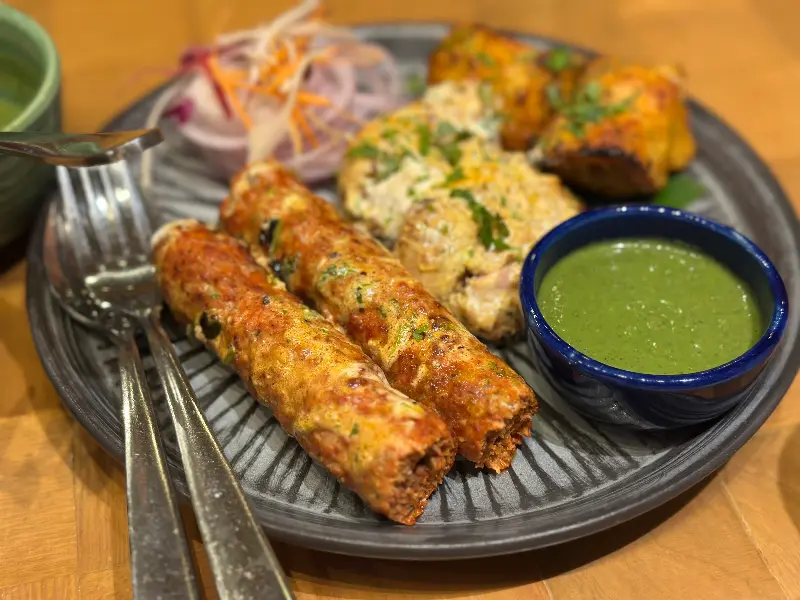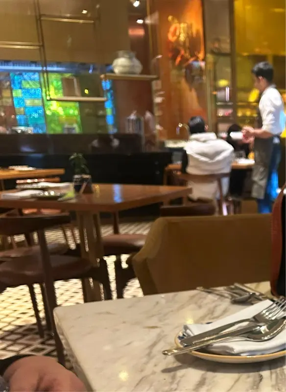 레스토랑 내부는 깔끔하고 현대적인 분위기였다. 대리석 테이블 위에는 은색 커트러리가 정갈하게 놓여 있었고, 테이블 간 간격도 넓어 편안하게 식사를 즐길 수 있었다. Image 1에서 보이는 것처럼 스테인드글라스 스타일의 장식도 눈에 띄어, 인도 전통과 현대적인 감각이 조화롭게 어우러진 공간이라는 느낌을 받았다. 직원들은 친절하고 능숙하게 손님들을 응대하는 모습이었다. 다만, 리뷰처럼 직원이 많다고 느낄 수도 있겠다.