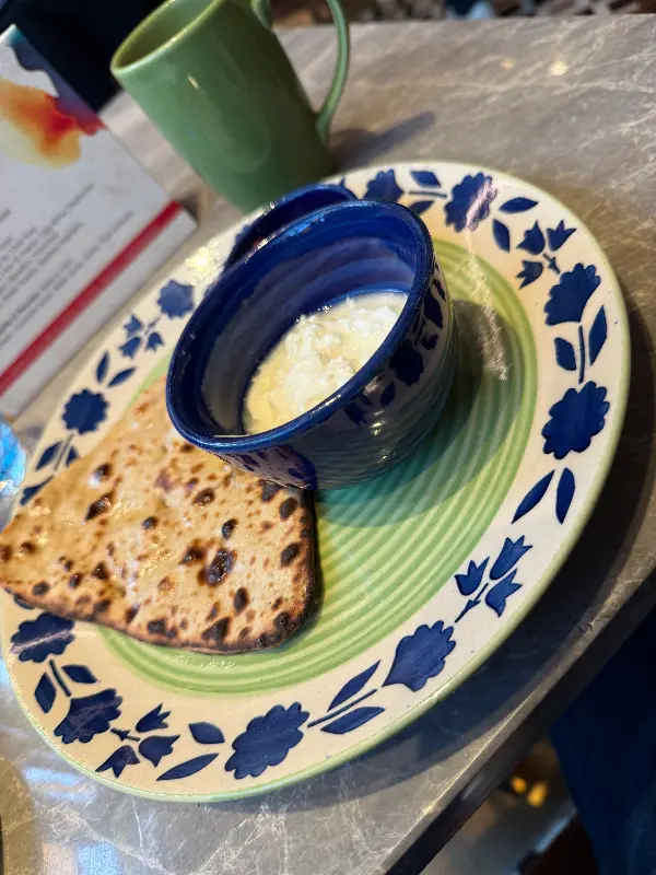 잠시 후, 잭프루트 요리가 테이블에 놓였다. 화려한 플레이팅에 감탄했고, 맛 또한 기대 이상이었다. 잭프루트 특유의 달콤하면서도 담백한 맛이 향신료와 어우러져 독특한 풍미를 자아냈다. 특히 특대형 밀 로티에는 틸이 장식되어 있어 더욱 고소하고 맛있었다. Image 6에서 보이는 것처럼, 겉은 바삭하고 속은 촉촉한 난은 그레이비와 함께 먹으니 더욱 풍성한 맛을 느낄 수 있었다. 그레이비에는 민트 잎, 다진 생강, 다진 고수, 기, 튀긴 아바라카이 등 다양한 재료가 들어가 풍미를 더했다.