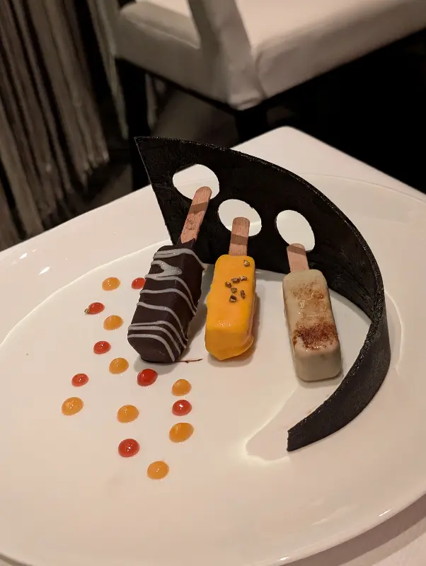 식사의 마지막을 장식하는 디저트 또한 훌륭했습니다. 밥 대신 디저트가 메뉴에 나올 정도로, Varq는 디저트에도 심혈을 기울이는 듯했습니다. 달콤하고 다채로운 디저트들은 입 안을 행복하게 마무리하며, 잊을 수 없는 미식 경험을 완성했습니다. 특히, 아이스크림 막대 형태로 제공되는 디저트는 시각적인 즐거움까지 더했습니다.
