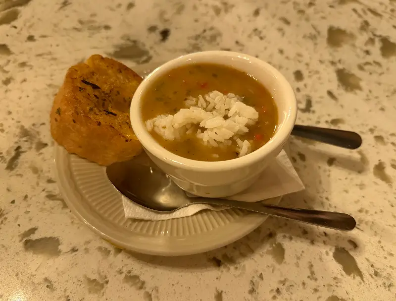 스푼으로 검보를 떠서 입안에 넣는 순간, 감탄사가 절로 나왔습니다. 깊고 풍부한 해산물 향과 함께 부드럽게 씹히는 쌀알의 조화가 환상적이었습니다. 맵지 않고 은은하게 퍼지는 향신료의 풍미는 입맛을 돋우기에 충분했습니다. 검보 위에 살짝 뿌려진 밥알이 묘하게 잘 어울렸다. 마치 따뜻한 위로를 받는 듯한 기분이었습니다.