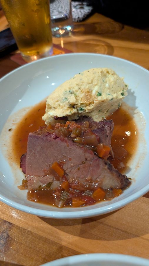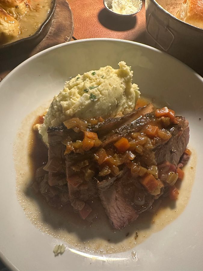 다른 메인 요리로는 토끼고기와 비스킷처럼 독특하고 맛있는 재료가 들어간 요리들이 많았고, 브리스킷 또한 훌륭한 균형감을 보여주며 잘 조리되었습니다. 부드럽게 익은 브리스킷은 고유의 풍미를 잃지 않으면서도 소스와 완벽하게 어우러져 깊은 만족감을 주었습니다.