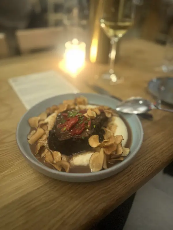 특히 소 볼살 요리는 잊을 수 없는 맛이었다. 포크를 대는 순간 부드럽게 찢어지는 고기는 입안에서 사르르 녹아내렸다. 진한 풍미와 부드러운 식감이 완벽하게 어우러져, 감탄사를 연발하게 만들었다. 접시 위에 놓인 섬세한 장식은 마치 예술 작품을 감상하는 듯한 기분을 선사했다. 짙은 색감의 고기 위로 뿌려진 붉은색 향신료는 시각적인 즐거움까지 더했다. 곁들여진 감자칩은 바삭한 식감을 더하며 풍성한 맛을 완성했다.