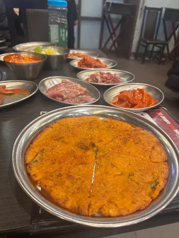 겉은 바삭하고 속은 촉촉한 김치전. 종로 바비큐 마켓의 숨겨진 별미다.