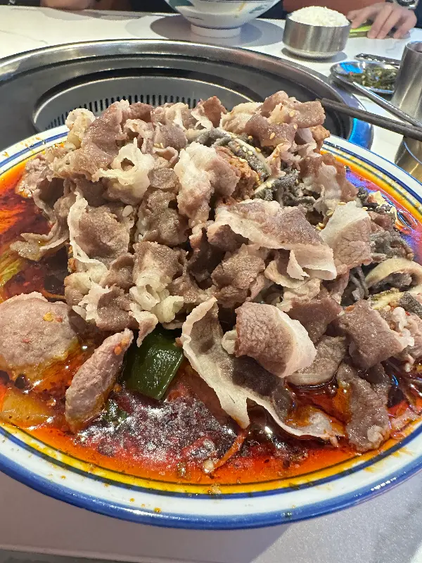고기의 윤기와 선명한 색깔은 신선함을 그대로 보여주는 듯했다. 얇게 썰린 고기를 육수에 살짝 담갔다 꺼내 입에 넣으니, 부드러운 식감과 함께 풍부한 육즙이 입안 가득 퍼졌다. 훠궈의 얼큰한 국물과 어우러진 고기의 풍미는, 추위로 굳었던 몸을 사르르 녹여주었다.
