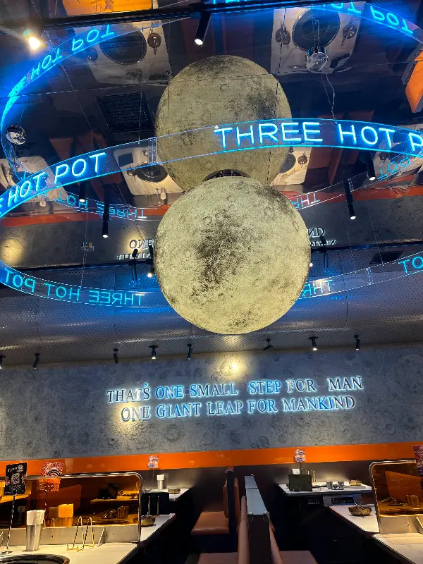 “That’s one small step for man, one giant leap for mankind.” 닐 암스트롱의 명언이 새겨진 벽면. Three Hot Pot Spot의 독특한 분위기를 더욱 돋보이게 한다.