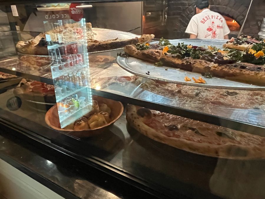 메뉴판에는 ‘PIES’, ‘HEROS’, ‘SALADS’, ‘BEER & WINE’, ‘DRINKS’ 등 다양한 선택지가 있었지만, 이곳에 온 목적은 오직 하나, 바로 피자였습니다. 카운터 너머로는 갓 구워져 나온 듯한 먹음직스러운 피자 조각들이 투명한 쇼케이스 안에 진열되어 있었고, 그 뒤로는 뜨거운 오븐의 열기가 느껴지는 주방이 보였습니다. 직원들은 친절하고 활기찬 모습으로 손님들을 맞이하고 있었으며, 주문한 피자는 놀라울 정도로 빠르게 준비되었습니다.