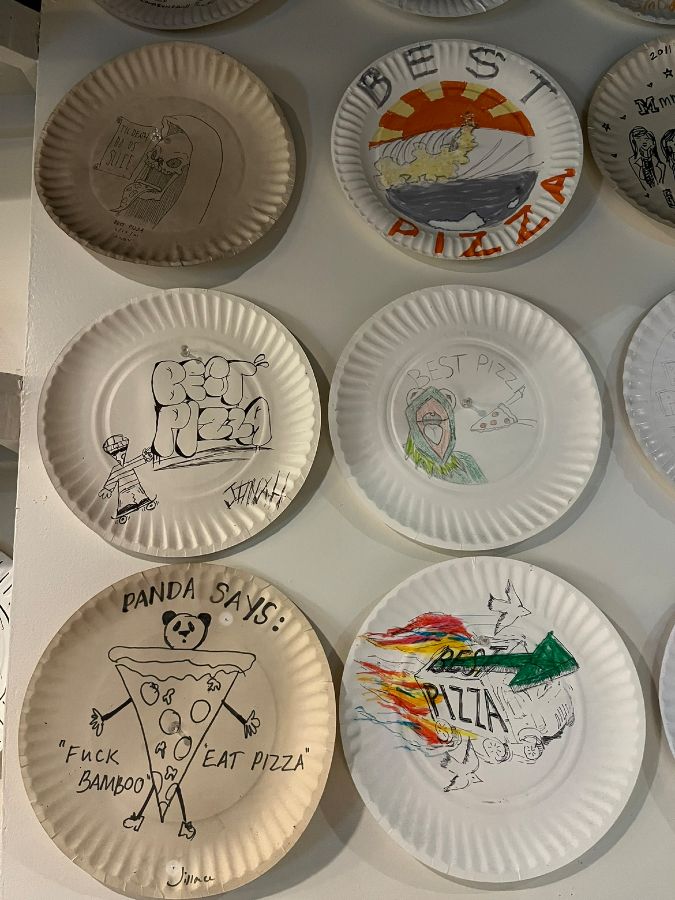 이곳은 단순히 맛있는 피자를 파는 곳을 넘어, 브루클린의 소박하지만 친근한 분위기를 고스란히 담고 있는 문화 공간 같았습니다. 벽면에는 손님들이 직접 그린 듯한 독특하고 창의적인 그림들이 담긴 종이 접시들이 가득했습니다. ‘BEST PIZZA’라는 문구를 재치 있게 표현한 그림부터 개성 넘치는 캐릭터까지, 이곳을 찾은 사람들의 즐거웠던 기억과 애정이 고스란히 담겨 있는 듯했습니다. 이러한 작은 예술 작품들은 가게의 캐주얼하고 친근한 분위기를 더욱 풍성하게 만들었습니다.