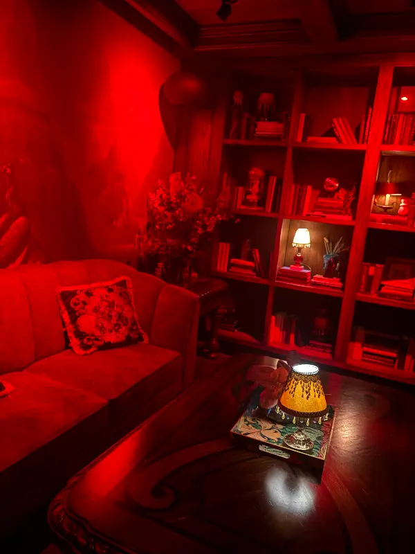 인테리어는 키치하면서도 클래식한 매력이 공존했다. 은은한 조명 아래, 세련된 스타일로 꾸며진 공간은 과하지 않으면서도 멋스러움을 풍겼다. 붉은 조명 아래 놓인 벨벳 소파와 책장 가득 꽂힌 책들은 아늑하면서도 비밀스러운 분위기를 더했다.