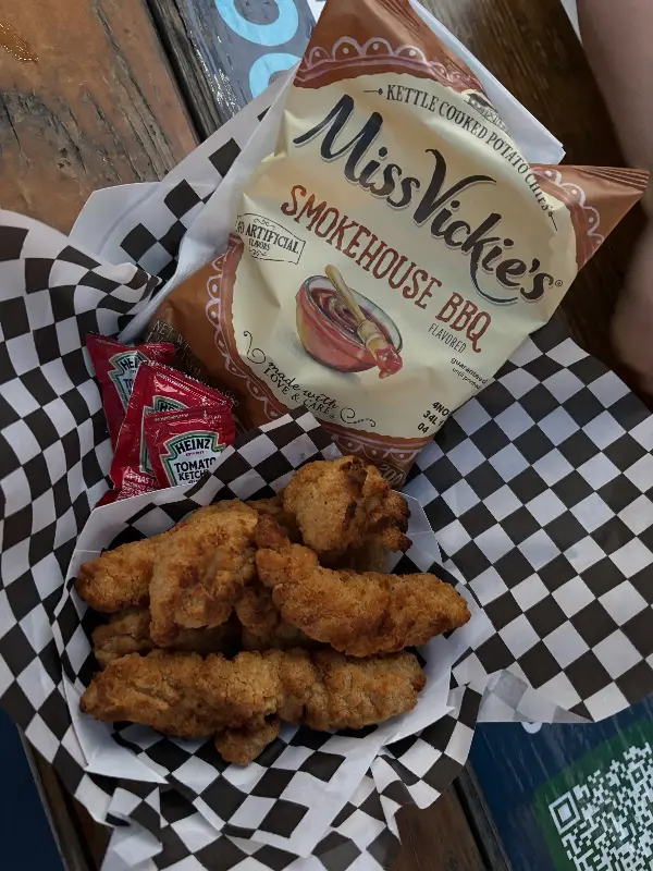 가볍게 즐길 수 있는 핫도그와 치킨텐더도 주문했습니다. 비어 가든 음식치고는 꽤 괜찮다는 평이 있었는데, 실제로도 만족스러웠습니다. 특별한 맛은 아니었지만, 맥주와 함께 즐기기에 부족함이 없었습니다. 특히 갓 튀겨져 나온 치킨텐더는 겉은 바삭하고 속은 촉촉하여 맥주를 계속 부르는 맛이었습니다.