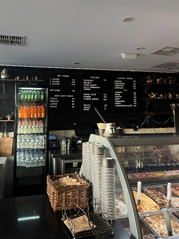 진열대 안에는 다양한 종류의 아이스크림이 가득했는데, 그중에서도 바클라바 맛과 스티키 데이트 맛이 눈에 띄었다. 마치 영화관 카라멜 팝콘을 떠올리게 하는 번트 카라멜 맛도 궁금했지만, 오늘은 터키 디저트의 정수를 느껴보기 위해 바클라바 맛을 선택했다. 메뉴판을 살펴보니 아이스크림 외에도 터키 커피와 다양한 음료도 판매하고 있었다. 검은색 보드에 흰색 글씨로 적힌 메뉴는 마치 칠판을 연상시키며, 정갈하게 정리된 컵들과 음료수 냉장고가 깔끔한 인상을 준다.
