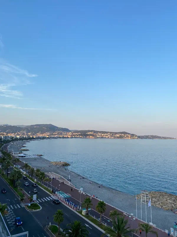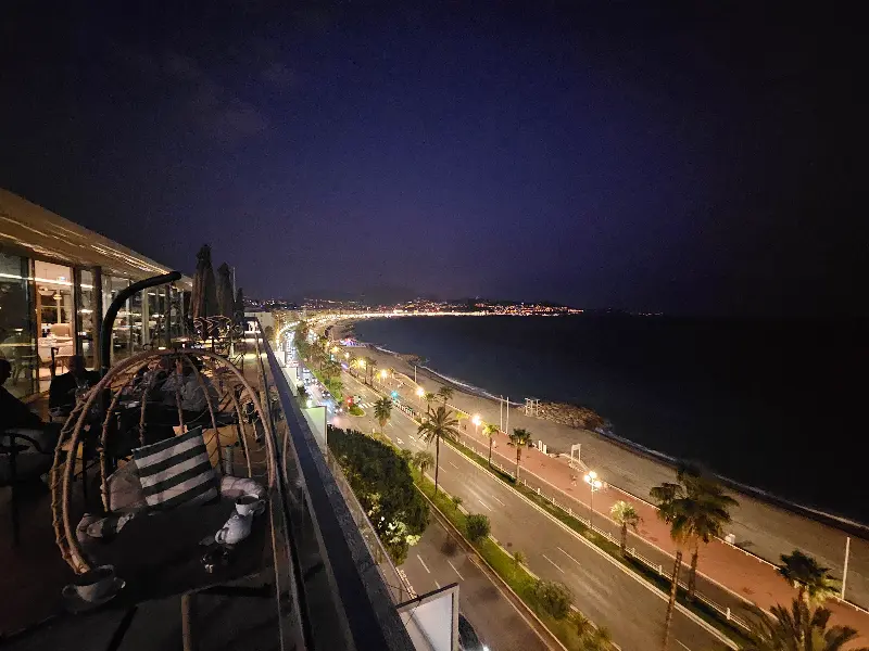 Baie des Anges가 한눈에 들어오는 옥상 테라스는 그야말로 최고의 위치였다. 밤이 깊어갈수록 니스의 야경은 더욱 빛을 발했고, 우리는 그 아름다운 풍경에 넋을 잃었다. 바람에 흔들리는 야자수, 반짝이는 해안 도로, 저 멀리 보이는 불빛들이 마치 한 폭의 그림 같았다.