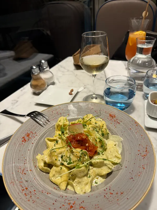 메뉴는 간결했지만, 신선한 재료를 사용한 요리들이 눈에 띄었다. 나는 토르텔리니를, 남편은 바 피쉬를 주문했다. 잠시 후, 테이블 위에 놓인 음식은 보기에도 아름다웠다.
