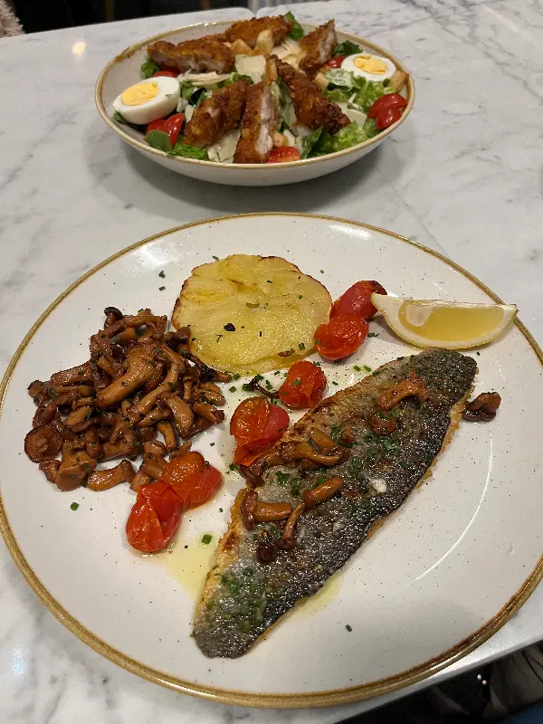 토르텔리니는 부드러운 파스타 안에 촉촉한 속이 가득 차 있었다. 한 입 베어 무는 순간, 입안 가득 퍼지는 풍미가 예술이었다. 신선한 허브와 치즈의 향이 어우러져, 잊을 수 없는 맛을 선사했다. 남편이 주문한 바 피쉬 역시 신선하고 담백했다. 겉은 바삭하고 속은 촉촉하게 구워져, 생선 특유의 비린 맛은 전혀 느껴지지 않았다.