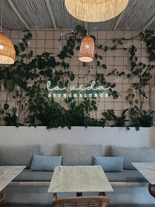 한쪽 벽면에는 “la vida BRUNCH & LUNCH”라고 쓰인 네온사인이 빛나고 있어, 이곳이 브런치와 런치 전문점임을 알려줍니다. 부드러운 색감의 쿠션이 놓인 소파 좌석은 편안함을 더하고, 친구와 함께, 혹은 혼자서 여유로운 시간을 보내기에도 안성맞춤입니다. 특히 곳곳에 놓인 아기자기한 소품들은 마치 인스타 감성을 자극하는 듯했습니다.