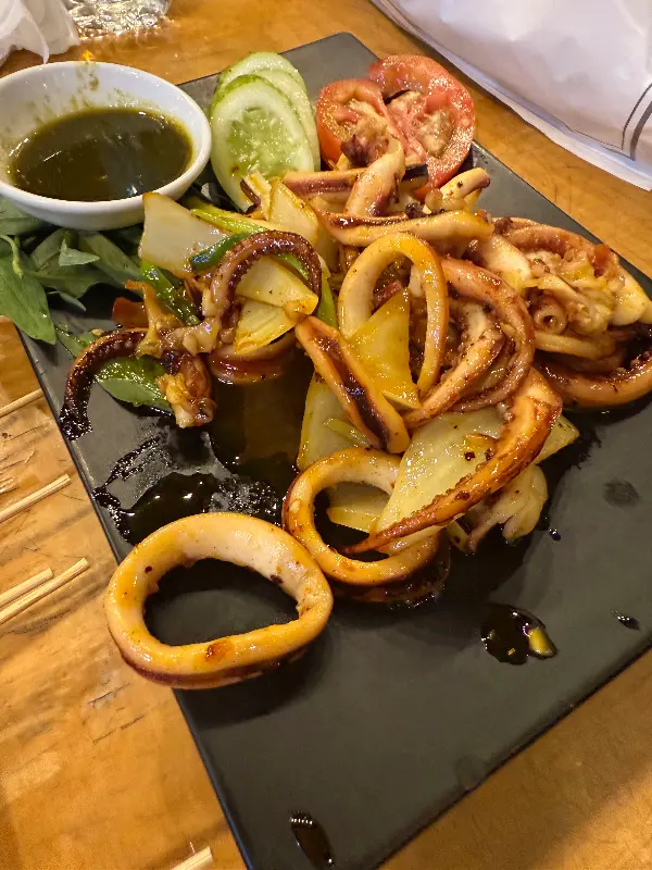 오징어 구이는 쫄깃한 식감과 짭짤한 양념이 완벽하게 어우러져, 젓가락을 멈출 수 없게 만들었습니다. 함께 제공된 소스에 찍어 먹으니, 풍미가 더욱 깊어졌습니다. 석쇠 위에서 구워진 듯한 오징어의 표면은 불맛을 은은하게 풍기며 미각을 자극했습니다.