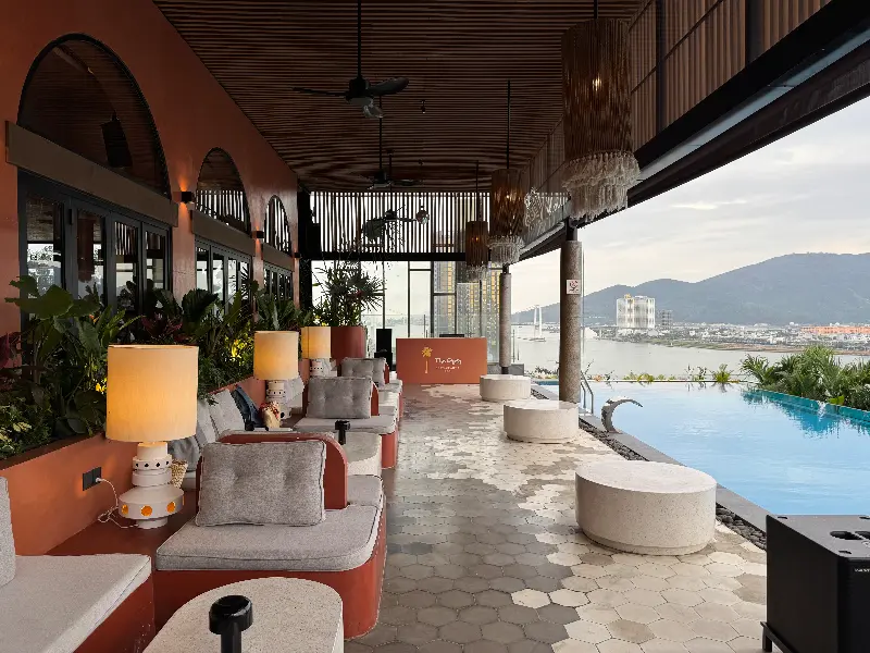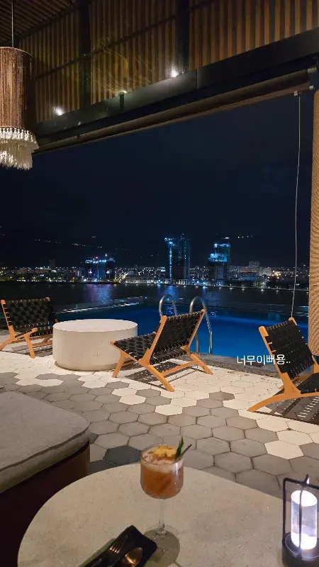 The Gypsy Da Nang에 들어서는 순간, 탄성이 절로 나왔다. 10층 높이에서 바라보는 다낭 시내의 야경은 숨 막힐 듯 아름다웠다. 형형색색의 불빛들이 한강을 따라 반짝이는 모습은 마치 보석을 흩뿌려 놓은 듯했다. 루프탑에는 푸른 빛깔의 풀장이 자리하고 있어, 이국적인 분위기를 한층 더 고조시켰다.