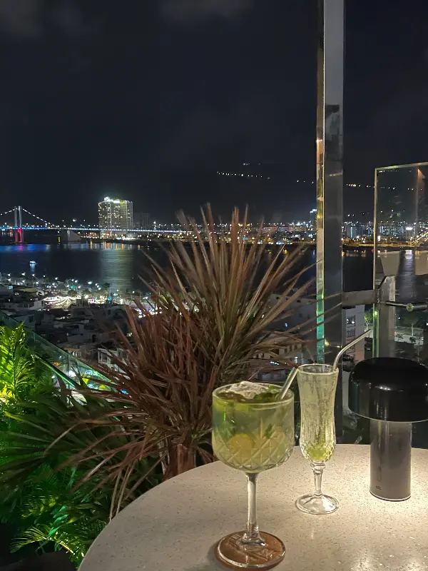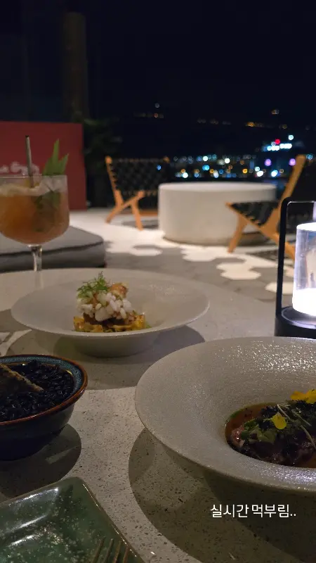실내 창가 자리를 예약했지만, 밖에서 칵테일을 즐기다가 식사를 해도 된다는 직원의 친절한 배려에 감동했다. 시원한 바람을 맞으며 칵테일을 홀짝이니, 여행의 피로가 눈 녹듯이 사라지는 기분이었다. 사진 속 칵테일처럼, 달콤함과 상큼함이 어우러진 맛은 야경을 감상하는 즐거움을 더욱 배가시켜 주었다.