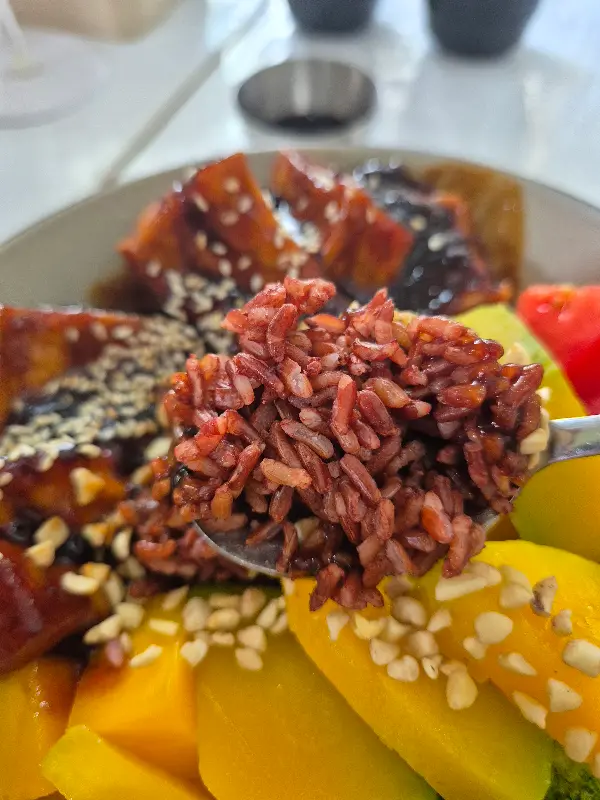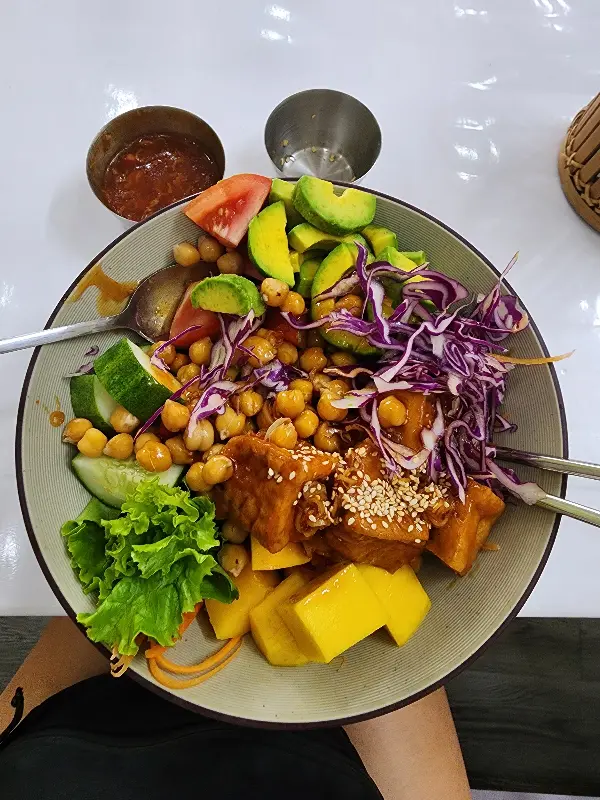 잠시 후, 드디어 기다리던 메뉴가 나왔다. 망고, 아보카도, 토마토, 당근, 양상추, 오이 등 알록달록한 채소들이 보기 좋게 담겨 있었다. 샐러드 위에는 노릇하게 구워진 두부가 얹어져 있었고, 레몬그라스 소스가 곁들여져 나왔다. 매운 고추를 요청하니 흔쾌히 가져다주셨다.